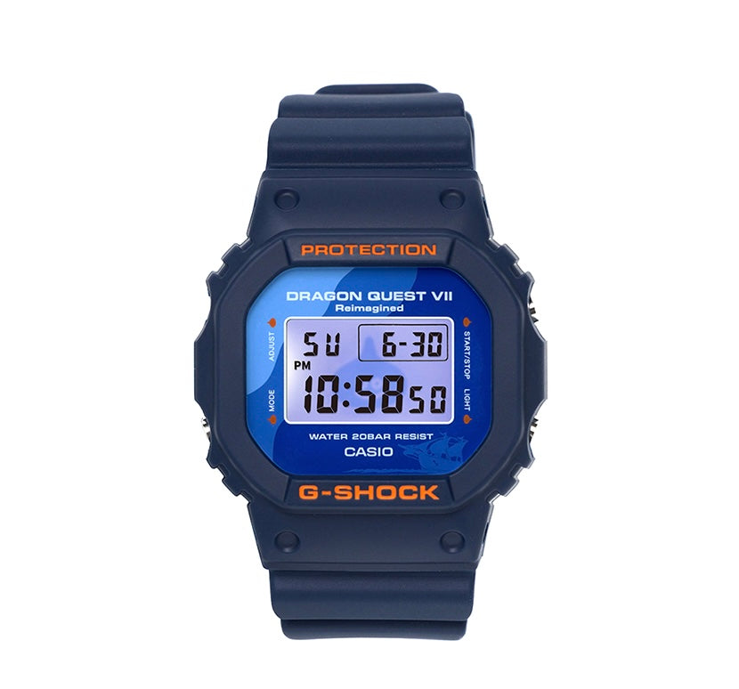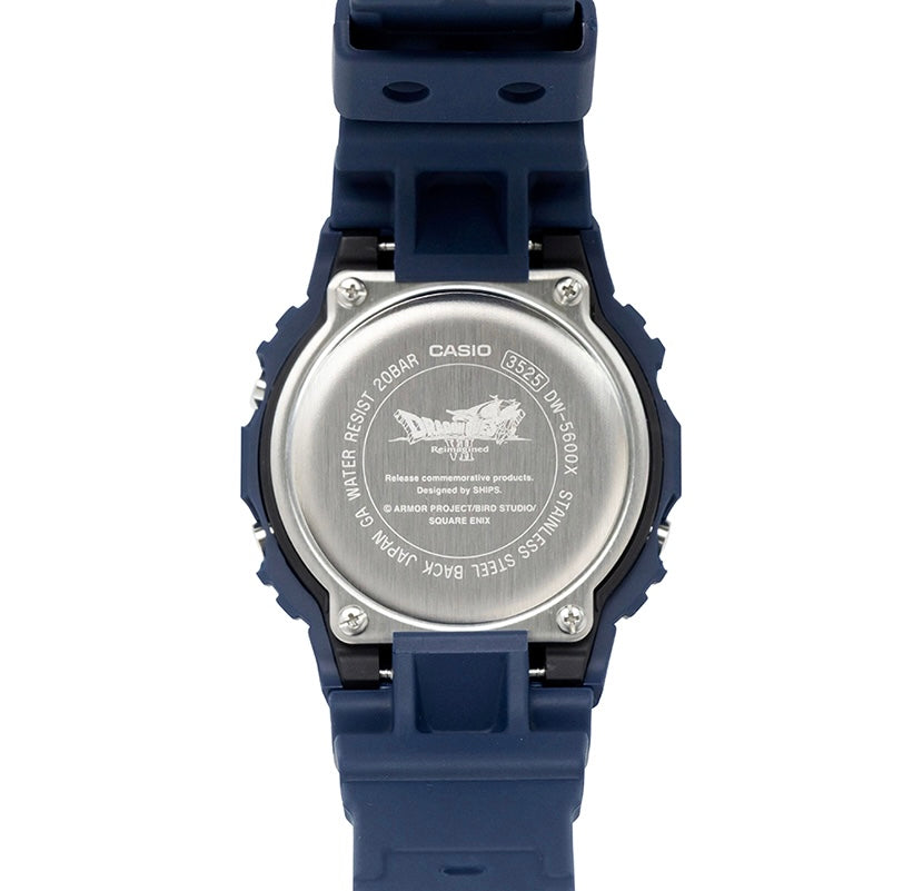 Introducing a long-awaited collaboration based on the G-SHOCK classic DW-5600. The SHIPS navy body is accented with the blue and orange theme colors of Dragon Quest VII Reimagined, and the dial features a nautical silhouette of the sea and a ship. An adorable slime sits in the center. The backlight uses a blue color associated with slime. The slime silhouette is also subtly hidden in the function icons on the four corners. As proof of the collaboration, the case back is engraved with the DQ7R logo and "DESIGNED by SHIPS," and it comes with a special tin case. It is a watch worthy of the limited special edition "Treasure Box."