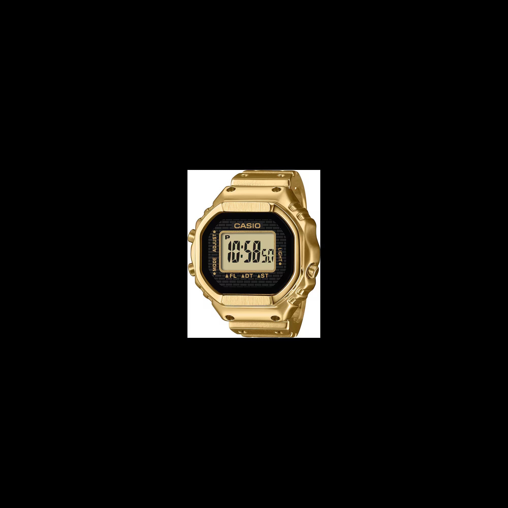 This model recreates the functionality and complex design of a Casio watch in ring size. The stainless steel ring is crafted with advanced metal injection molding technology and finished with gold-colored ion plating. The monocoque structure and glass bonding technology enhance airtightness, making it waterproof for everyday use. It is approximately 1.5 times longer than a typical watch module.
