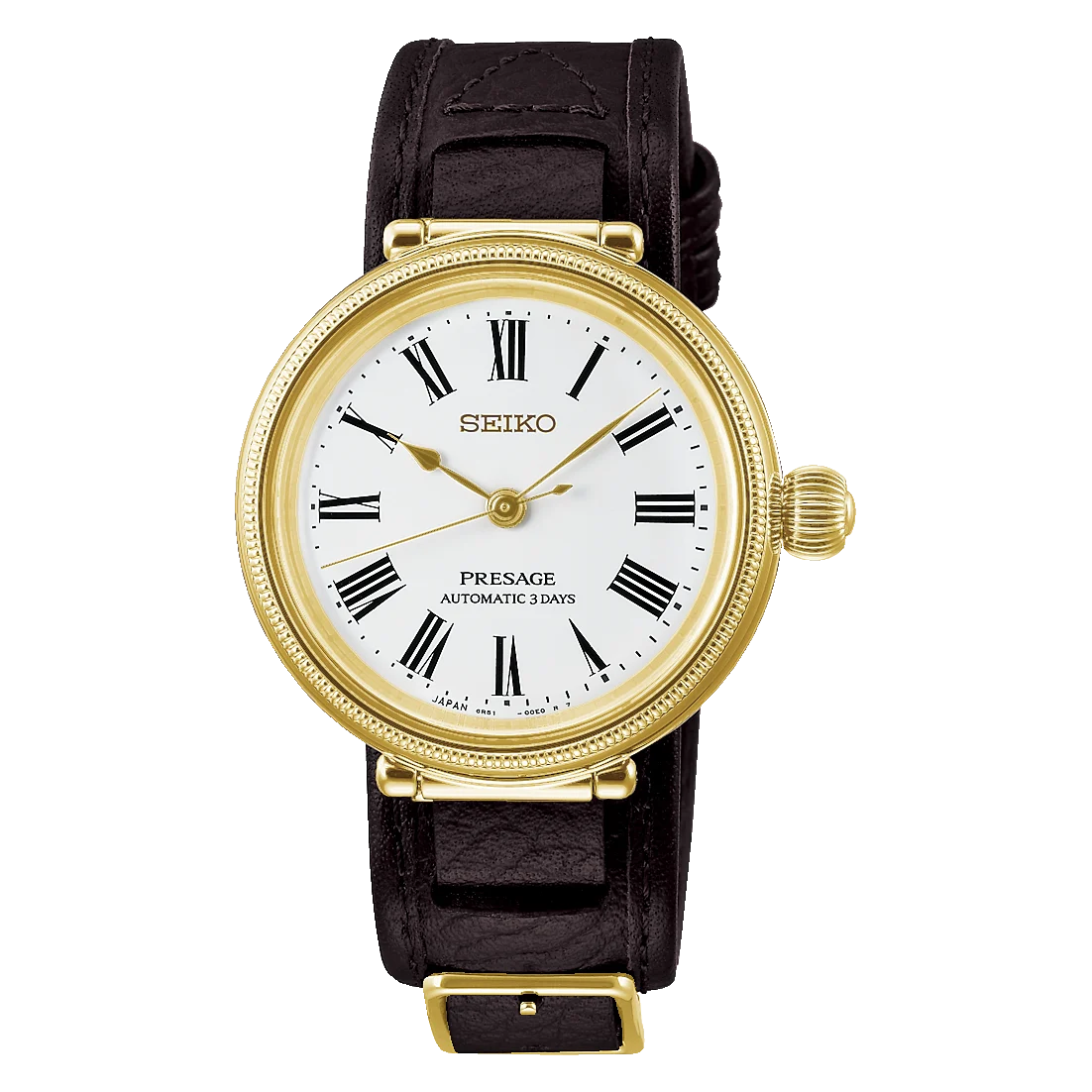Its features are reminiscent of the 1895 original, including a millegrain decoration around the gold-coloured case, large ‘onion-style’ crown design, classic Roman numerals, and elegant hands. The strap features moveable lugs and special pull-through sustainable LWG-approved leather. Gold accent colouring signifies the achievements of Seiko’s founder, Kintaro Hattori. Under a box sapphire glass is a warm white hand-enamelled dial with a uniquely soft sheen.